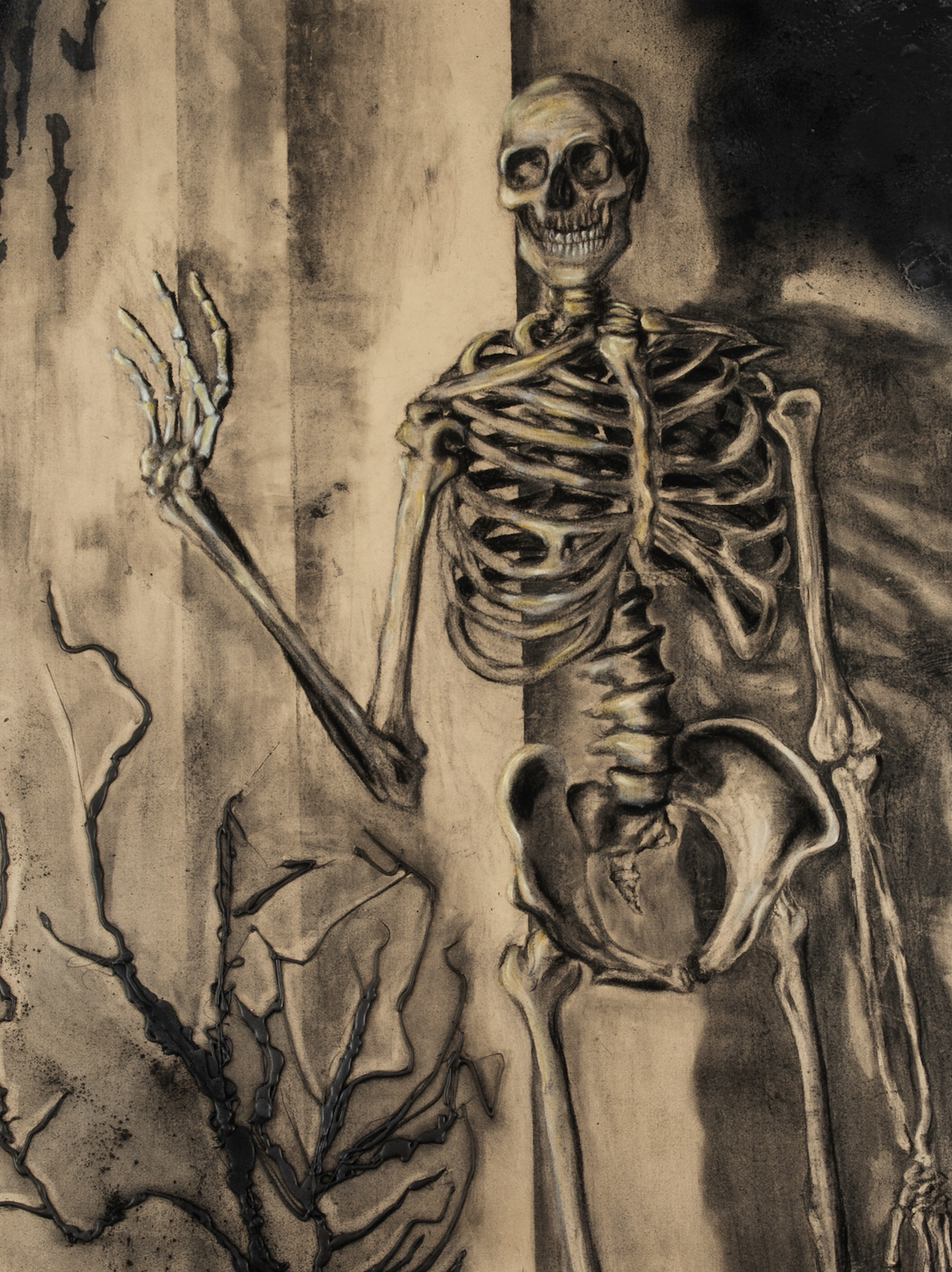 The interplay of light and shadow breathes movement into the bones, while the textured background evokes a sense of decay and inevitability. The contrast between presence and emptiness, past and present, suggests a haunting question: Are we ever free from our own repetition, or are we fated to reach for the same illusions, time and time again?