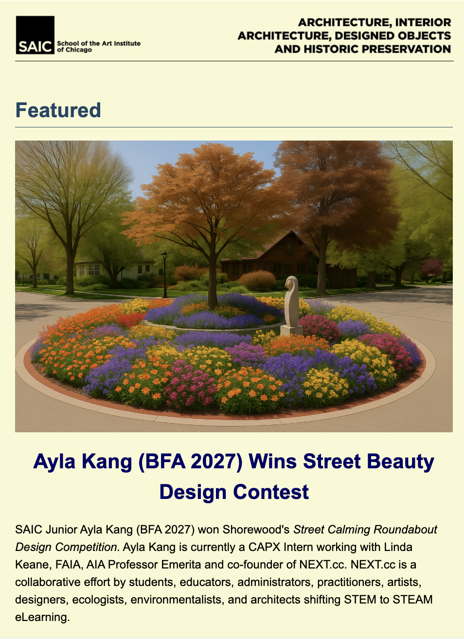 I was awarded First Place in the Imaginary Street Beauty Design Contest, an independent community competition organized by the Shorewood Complete Streets Coalition and Greater Shorewood Bikers. This was not a school assignment, but a public design initiative inviting participants to propose a new vision for the neighborhood roundabout at Murray & Beverly. My winning proposal was featured in a published article highlighting the selected design, and I was also recognized in my school’s newsletter following the announcement. The concept combined traffic-calming infrastructure with a sculptural and sustainable approach, including the transformation of the central feature into a solar-powered element. The design has moved forward into implementation as part of a larger neighborhood redevelopment effort valued at approximately $300,000. This project reflects my interest in bridging visual communication, public space, and functional urban design through work that exists beyond the classroom and engages directly with real communities.
