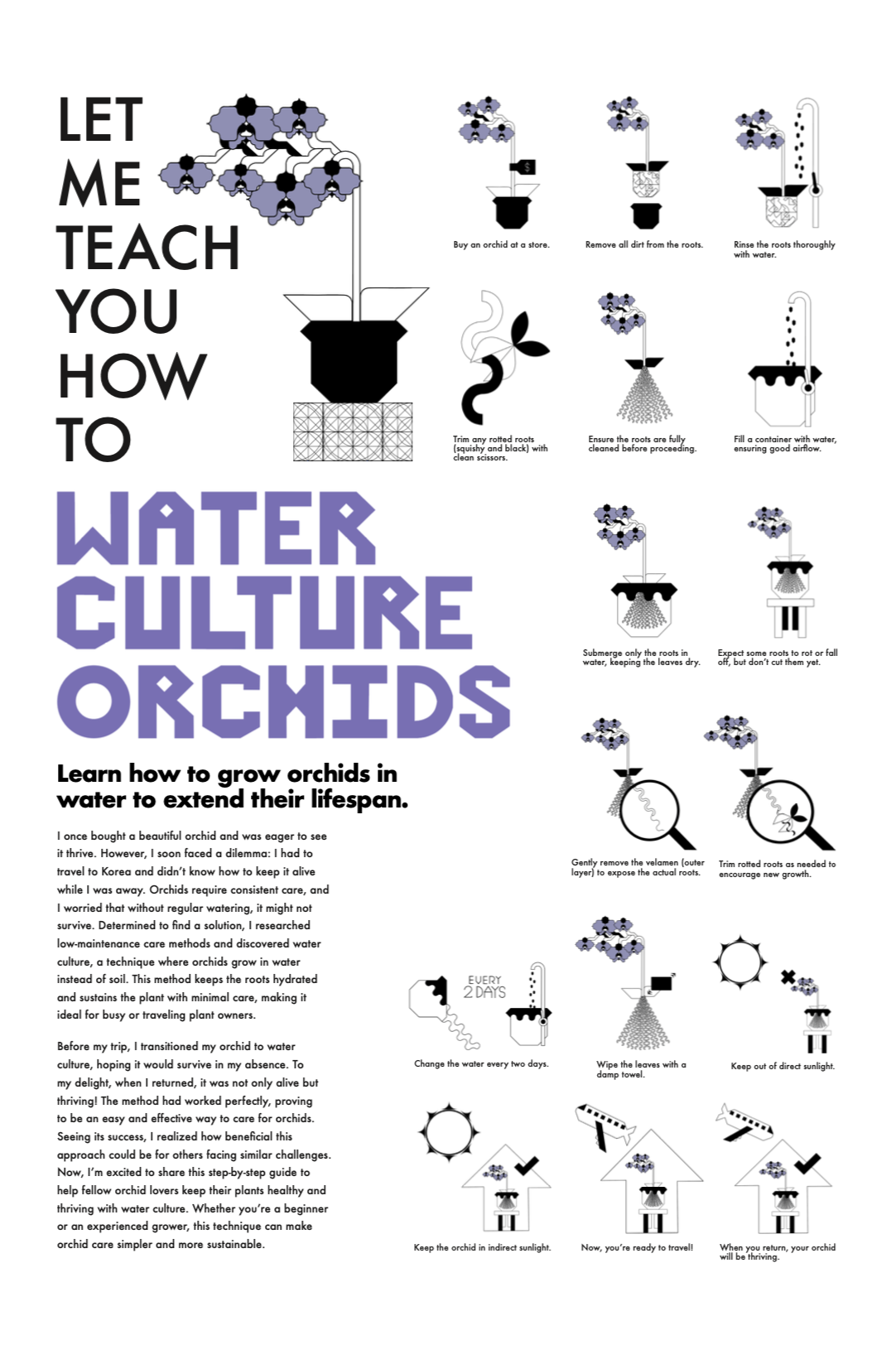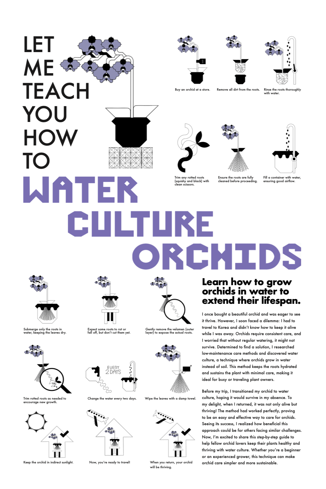 This instructional poster provides a clear, visual guide for growing orchids in water culture, a low-maintenance alternative to traditional soil planting. Using custom illustrations and a clean layout, I explained each step of the process, making the information accessible to both beginners and experienced plant enthusiasts. The design balances functionality and aesthetics, demonstrating my ability to communicate complex processes through visual hierarchy and iconography.