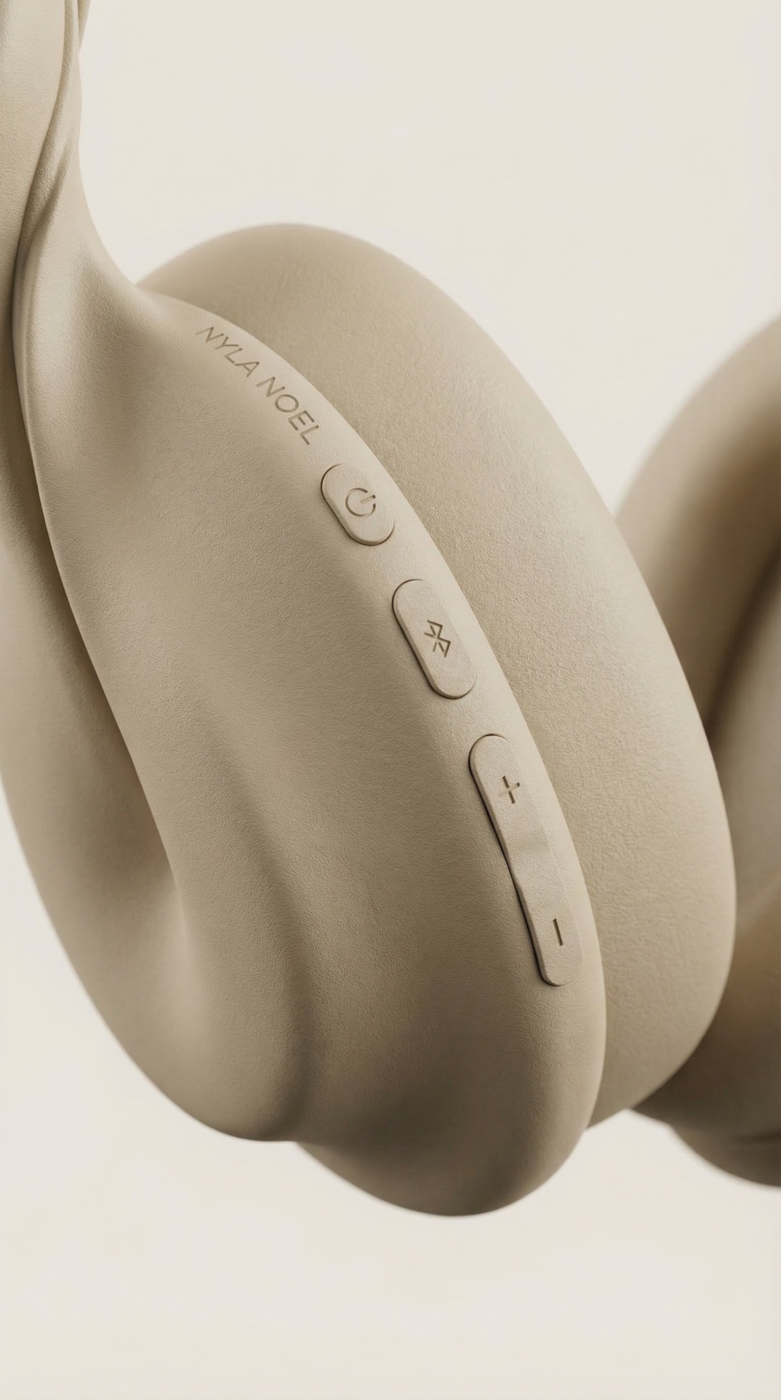 This AI-generated visual was developed as part of an exploratory project to better understand emerging tools and workflows within contemporary design practice. While my core approach to art and design remains grounded in personal authorship, material experimentation, and the development of my own visual language, I recognize the growing presence of AI within an evolving creative landscape. The fictional brand Nyla Noel was created as a conceptual exercise, where I designed a series of sculptural headphone forms through AI-assisted image generation.